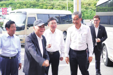 曹董與李寧在報紙機前合影。開業(yè)剪彩現(xiàn)場。...